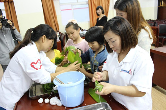 安利伙伴在教小朋友們包粽子