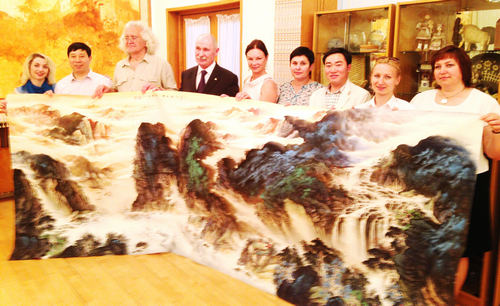 當著名旅美畫家王鉦朗(王余根)將一幅山水畫精品之作展示后,在場的白俄羅斯藝術家無不拍手稱贊。隨后,王鉦朗(王余根)向大使及各位白俄羅斯貴賓簡要介紹了這幅山水畫作品的創作過程和內涵,并表示要將這幅山水畫巨作饋贈大使館收藏!