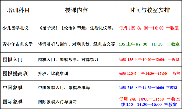 【培訓科目】 少兒國學禮儀、青少年古典文學素養、小學生作文、圍棋、中國象棋、國際象棋、書法、美術。