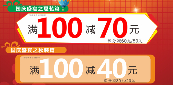 巨惠2、秋款上市 全場滿100減40元,部分減30元/20元;