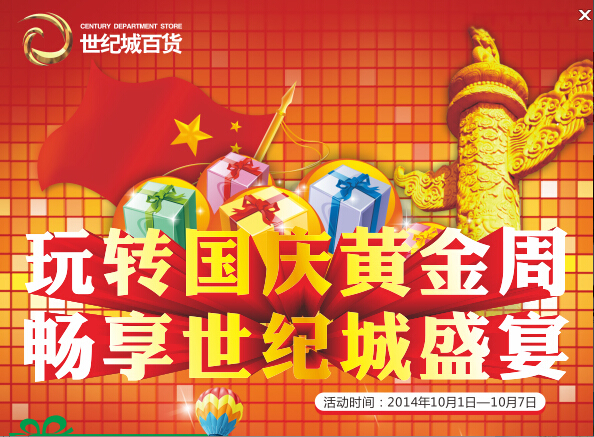 秋風送爽,天高云淡,在這個五谷豐登,萬物成熟收獲的季節,我們迎來了偉大祖國65周年華誕。作為黔東南唯一一家集時尚百貨、超市、餐飲、KTV、電影院、健身房及酒店為一體的大型購物中心,凱里世紀城百貨率先行動。據了解,一場主題為“玩轉國慶黃金周 暢享世紀城盛宴”的大型國慶獻禮活動將于10月1日至10月7日期間展開,屆時包括滿減、滿額送禮、大特賣、抽獎、折扣、會員活動、品牌聯合促銷等12重大力度促銷隆重上演。