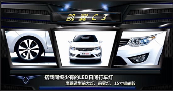外觀飾件方面,凱翼C3將搭載鷹眼式遠(yuǎn)近光獨(dú)立透鏡前大燈、十幅動(dòng)感鋁合金輪轂、鍍鉻裝飾前霧燈、高亮度LED運(yùn)動(dòng)尾燈,更有LED日間行車燈,這在同級(jí)車型中實(shí)屬少見。
