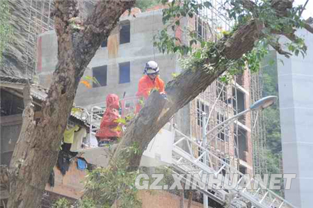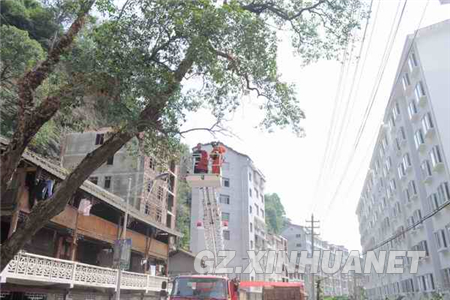 14時07分,排險隊伍到達現場,經勘察后確定該古樹已經枯死,高約14米,樹干直徑約1.3米,北面臨街,東西兩面均為民房,排險人員無法攀爬上樹捆綁繩索。經研究后,排險隊迅速制定出排險方案。排險隊伍立即分成三個組。一是固定組,由民警及3名消防官兵利用絕緣桿將繩索從古樹分丫處穿過,用繩索從南面將古樹進行固定、牽引。二是破拆組,主要由消防人員乘云梯利用機動鏈鋸、斧頭等工具對古樹進行分段切割,再利用繩索將樹干已被切割大半的古樹拉倒。三是警戒組,由一名消防戰士作為警戒哨,該村村民負責周圍人員疏散。