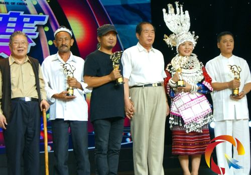 身著苗族盛裝的邰昌麗在頒獎晚會上領獎