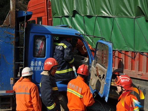 12時50分,大隊官兵到達現場后,現場一片狼藉,卡車車頭嚴重變形,前擋風玻璃被撞碎脫落,方向盤變形和司機腿部擠壓在一起,致使卡車車廂內被困人員動彈不得。救援消防官兵迅速對被困駕駛員展開救援。救援中,中隊官兵使用利用液壓鉗對車門實施破拆,擴充車內空間。經過30分鐘努力,成功將被困人員救出,立即被送往醫院進行救治。