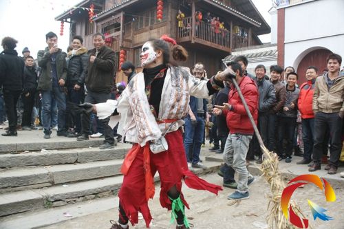 2月14,元宵佳節,貴州省錦屏隆里古城舉行“花險龍”慶祝活動,讓人感受狂歡黑花臉的醉意,吸引各地游客前來觀賞.