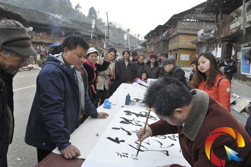 活動即將結束的前一天,黔東南州文聯副主席周忠良、白芬一行也來到黃崗村,州書法家協會現場為村民義務書寫春聯、捐贈書法作品。晚上,在黎平縣委辦、村委會的主持下,開展了畫家、書法家、舞協及村表演隊同臺文藝表演篝火晚會,精采的節目贏得觀眾陣陣掌聲和歡呼聲……