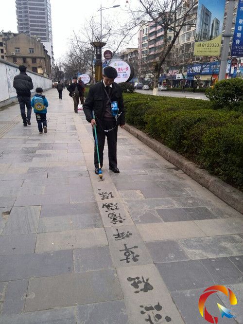 3月15日下午5時,記者經過北京西路時,遠遠看見一位老人掛著“吊瓶”在練字。“人老了,老在家坐著太悶,出來活動活動”,老人對記者說道。據了解,這位老人姓周,今年86歲,平時喜愛練書法。