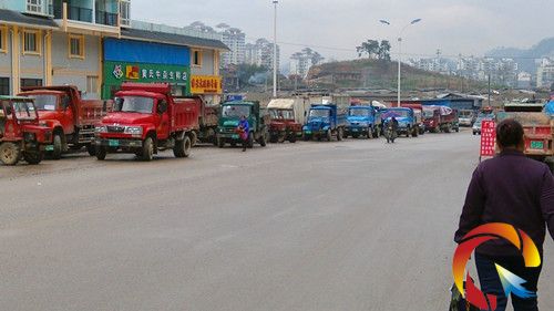 道路兩旁停滿了貨車