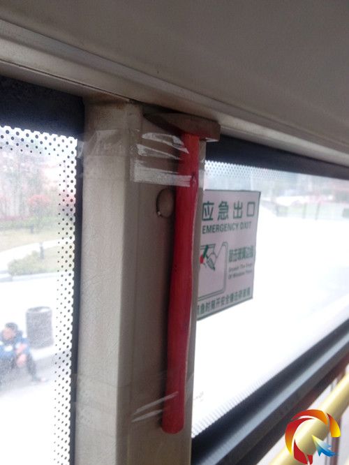 “我們這批車沒有配備標準的安全錘,但現在用透明膠粘的安全錘不會松,很安全的”,該車司機面對記者的疑問做出了此解釋。