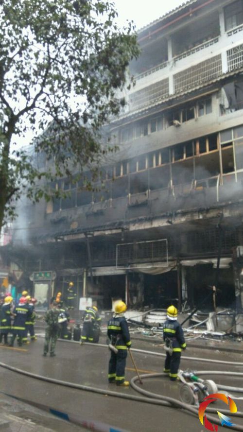 記者在現場看見事發地為一棟商住兩用樓,一樓為店鋪門面,二樓據稱為某網吧,一樓和二樓均遭受火災。現場一片狼藉,散碎的玻璃灑滿一地,墻面都已被熏黑。消防隊員調來數臺消防車,正全力滅火。