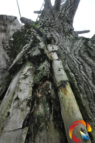 古銀杏的樹干已經(jīng)脫皮,沒有脫皮的地方則已發(fā)霉,霉菌都長出來了。架設(shè)在樹干中下部與地面之間的12株小銀杏,均已枯死,有的還出現(xiàn)了脫皮現(xiàn)象,已無法再為古樹全身輸送營養(yǎng)。