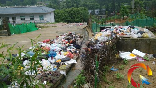 幾個垃圾池由于已經堆滿垃圾,更多的垃圾被丟在垃圾池外面。由于才下過一場大雨,垃圾池散發著刺鼻的氣味,部分垃圾從垃圾池被沖到路上。