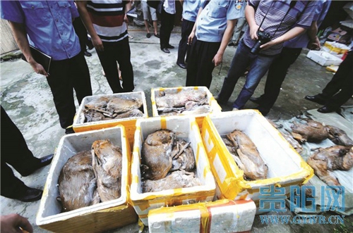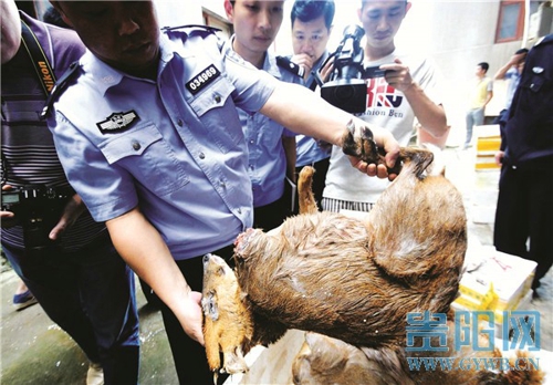 17日,民警在該民宅內及冰庫中搜出大量野生動物,其中活體動物有大王蛇35市斤、烏梢蛇32市斤、菜花蛇10市斤、石蛙88市斤以及麂子死體500市斤(約40只),另外還有一頭野豬。
