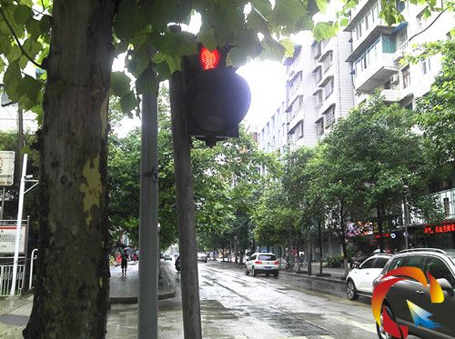 昨日下午,記者在金井加油站十字路口,見到了這個“鬧脾氣”把頭扭到一旁的人行道紅綠燈。