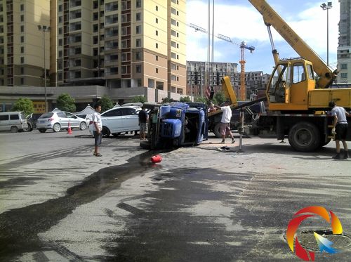 記者看到,一輛農用拖拉機車翻在馬路中間,后面停著一輛白色的轎車,車頭已經完全被撞毀。事發現場流了一地的機油,拖拉機的擋風玻璃已經碎了一地。