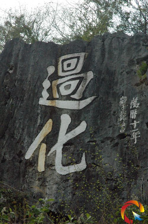 3月26日,記者在石帽山上看到,“過化”二字陰刻在山東面斷壁崖上,書體為直行楷書,每字1.5米見方,左側陰刻“萬歷十一年鄧子龍書”兩行小楷。筆劃均用石灰填白,遠在兩里之遙都清晰可辨。
