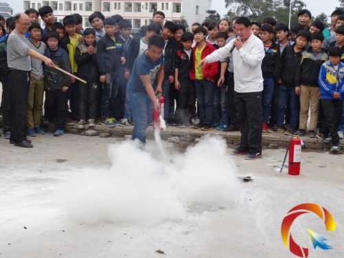 緊急疏散演練結束后,師生們又來到該校的足球場地實地觀看并參與如何使用滅火器滅火的演練。