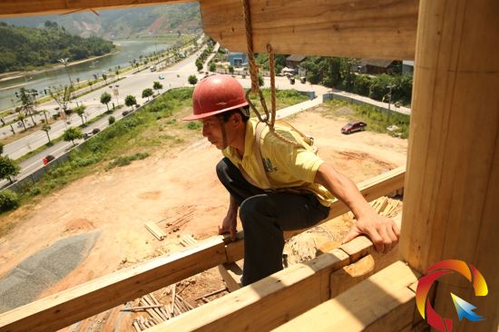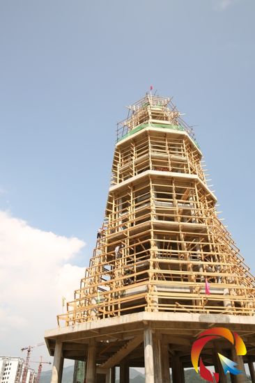 正在建造的高聳入云端的榕江鼓樓