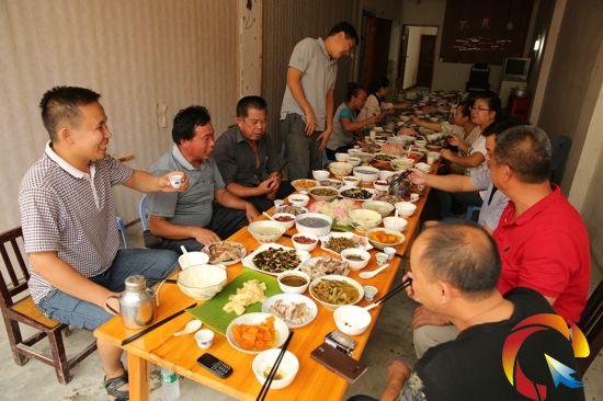 據了解,這個節日已經在當地延續了700多年。而吃長桌飯是該節日的固有的規矩,長桌上擺著雞鴨魚、狗肉、兔子肉、生魚片等,十分豐富。圖為龍額村一姚姓人家吃長桌飯的情景。(陸書明 姚仕國 楊帆 攝影報道)