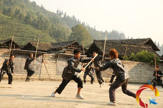 據了解,覓洞村的武打共分為三大類:拳法、棍法、刀法。如今,覓洞村的武打拳術成為強身健體、自衛防身的的傳家寶(圖為覓洞村的青年正在練習棍法對攻的情形)。(陸書明 吳重貴 攝影報道)
