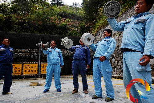 本網訊 11月8日,貴州省黔東南州黎平縣,貴州電網黎平供電局水口供電所員工正在用廢舊的電力材料當“啞鈴”開展健身活動。