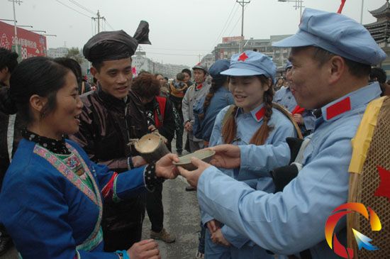本網訊 12月15日至22日,黎平各族群眾隆重舉行紀念紅軍長征進入黎平侗鄉80周年活動。活動開幕后,“毛澤東”、“周恩來”、“朱德”等老一輩無產階級革命家于1934年12月16日率領中國工農紅軍走進黎平縣城的場景再現,許多群眾自發為“紅軍阿哥”送米酒、草鞋、布鞋等。
