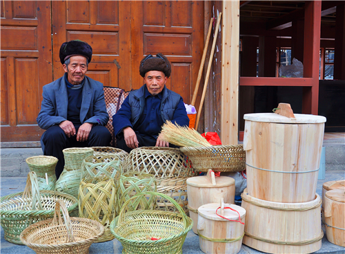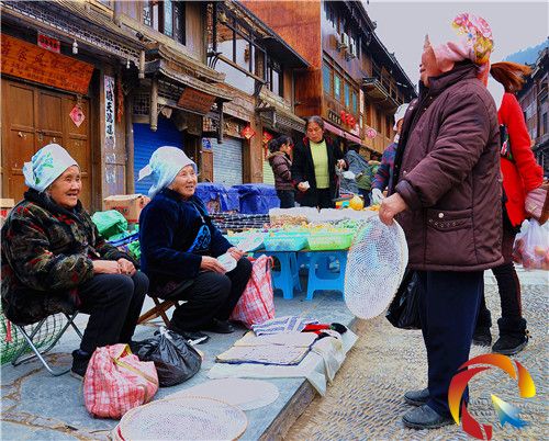 1月16日,暖陽融融。恰逢千戶苗寨西江亥日趕集,春節前的鄉鎮集市,人流如織。筆者在集市看到,許多七八十歲的老人,將自己手工編織、打制的家用、農用、娛玩用的竹器、木器等生產生活用具擺在街邊銷售,真實的材質、扎實的質量,老人的手藝、精致的工藝,吸引了眾多市民、農婦、游客的青睞。