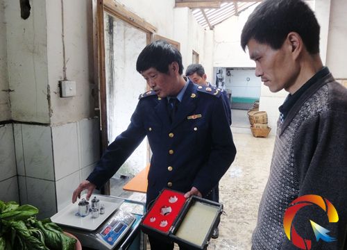 工商執(zhí)法人員在茶青收購(gòu)點(diǎn)檢查計(jì)量器電子稱