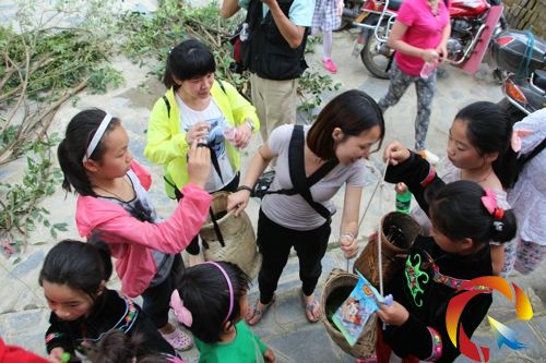 杭州的小學生與烏東村的小學生在開展夏令營活動,圖為大家在比誰采的茶葉多,學生身后的柴火也是他們的勞動成果