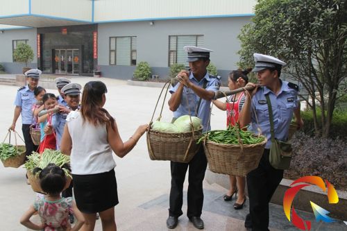 民警挑著蔬菜,送到從江縣明達水泥廠