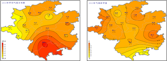 圖1 黔東南州16縣市2013年年平均氣溫及距平