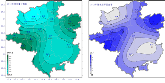 圖2 黔東南州16縣市2013年年降水及距平百分率