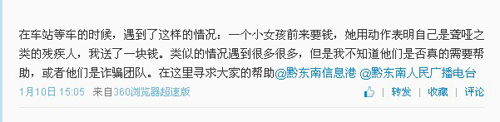 據凱里市民微博爆料,近日在凱里客車站經常遇到一些聾啞人,手持簽名簿,比劃著讓大家捐款。該市民向本港咨詢,希望確定他們是否真的需要幫助,或者利用愛心進行詐騙。記者帶著疑問將對此進行調查。
