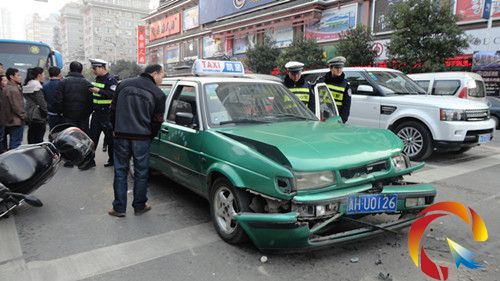 該事故中共有5輛車受到不同程度損壞,其中出租車的車頭和車尾因受到擠壓,損壞最為嚴重。銀灰色汽車的車尾和一輛紅色轎車車頭及車身受到損壞,1路公交車以及一輛電動車也受其影響。