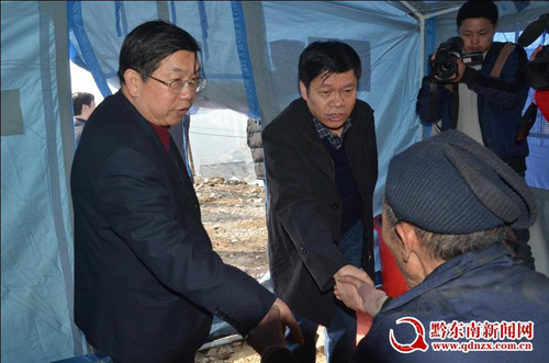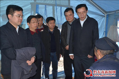 2014年1月30日,州四大班主要領導州委書記李飛躍、州長廖飛、州人大主任羅亮權、州政協主席梁承祥以及州委常委副州長馮仕文、州委秘書長耿生荗、州委組織部長王貴、州政協副主席鄧錦光一行,農歷臘月年三十慰問鎮遠縣報京受災群眾。李飛躍走進救災帳篷,與群眾促膝交淡,問寒問暖。(丁新成)