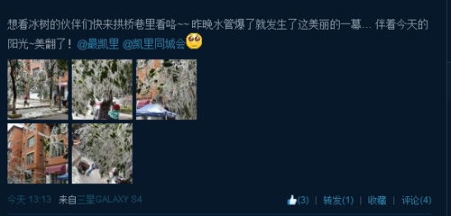 “想看冰樹的伙伴們快來拱橋巷里看咯~~ 昨晚水管爆了就發生了這美麗的一幕… 伴著今天的陽光~美翻了!”2月13日,新浪網友在微博圖文并茂給大家展示著這美麗的一幕。事發地點位于凱里市拱橋巷糧食局宿舍樓,仔細一看,整棵樹掛滿了“冰棍”。