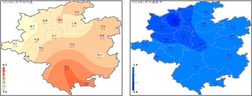 氣溫:黔東南16縣市地面氣象觀測站2月平均氣溫為3.5℃(黃平)~8.2℃(榕江)(圖1左),與歷年同期比較偏低1.6℃(天柱、錦屏)~2.8℃(施秉)(圖1右);月極端最低氣溫-5.2℃(丹寨)~0.3℃(榕江),出現在11日、13~14日。6~12日大部地區最低氣溫在0℃以下,且伴有降水,有凝凍出現;17~18日大部地區出現降雪,但氣溫在0℃以下的時間相對較短,對農作物無較大的影響。