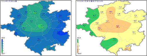 圖2 黔東南州16縣市2014年2月降水量及距平百分率