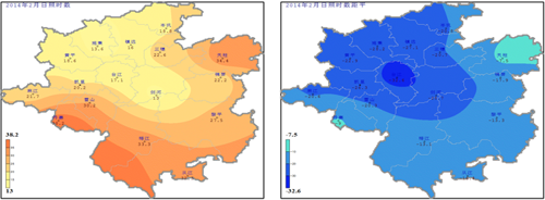 日照:2月日照時數為13h(劍河)~38.2h(丹寨)(圖3左),與歷年同期比較偏少7.5h(天柱)~32.6h(臺江)(圖3右)。1~4日、14~15日州內大部地區出現了持續晴朗天氣,光照充足;其余大部時間以低溫陰雨天氣為主。