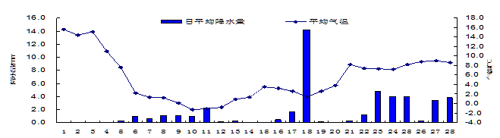 圖4 2月黔東南16縣市氣象站平均氣溫和降水量逐日演變圖