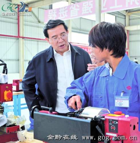 黔東南州州委書記李飛躍(左)在工業園區調研時與青年工人交談