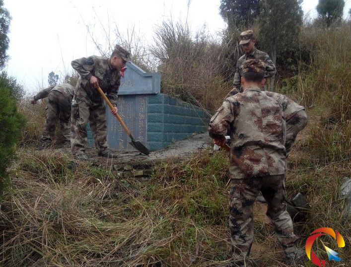 圖為縣人武部官兵為烈士除草現場