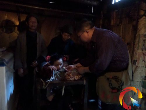 15:24,面包車沿著崎嶇蜿蜒的山路來到筆架片區老屋基村民組,來看望讓吳秘書揪心不已的11歲重病殘疾少女文吉翠。“小翠翠就呆坐在這間陰暗霉氣、屎尿雜味的破屋子里”。吳秘書見小翠翠父母不在家就對筆者說。文光陽支書到處尋找小翠翠父母,見其80歲爺爺文中海、75歲奶奶王國州在附近勞動,便請文爺爺、王奶奶過來打開小翠翠家側門。吳秘書提著新衣服、拎著雞蛋糕,走到小翠翠木椅旁。撫摸著她蒼白無血的小臉蛋,又不停地喂她雞蛋糕。小翠翠吃力地歪頭斜視在她身邊的爺爺、奶奶和吳秘書,這也許是她11年來最高興的一天,因為吳秘書專門為她買來了帶有梅花圖案的衣裳和紅花插邊的牛仔褲。