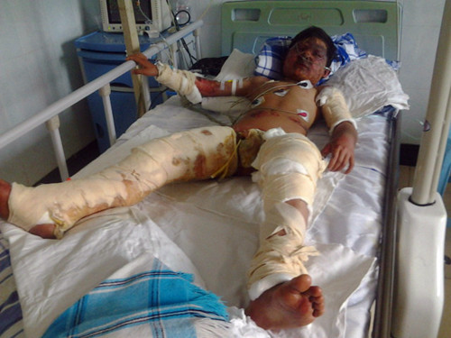 5月23日,記者來到潘祺所在的黔東南州人民醫院,走進病房看見他無助的躺在病床上,整個臉部、胸部以及雙腿都被大面積燒傷。