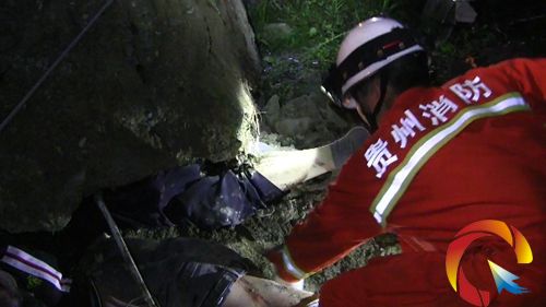 12日0時20分,消防官兵到達現場后,經詢問偵察發現,一輛越野車撞斷公路邊電線桿翻倒在陡峭的山坡下面,離路面距離近20米,車上有2人被甩出車外,后被垮塌的重達近10噸的電線桿水泥石墩埋壓,其中1人當場死亡,另1人大腿以下部位被埋壓,傷勢較重。了解情況后,消防官兵立即聯合現場交警和醫務人員對被困人員進行救援,但由于水泥石墩過重,救援人員想盡辦法也無法將被埋壓的人員救出。隨后,消防官兵使用搶險救援車的車載牽引繩對水泥石墩進行牽引,并指揮現場的其他救援力量用附近工地找來的鋼管協助牽引,確保不對被困人員造成二次傷害。經過近1個半小時的緊張救援,成功將2名被困人員救出。