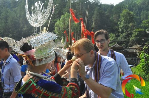 連著12道攔門酒讓“老外”們紛紛紛紛乍舌,記者在一旁聽到代表們一邊小聲的說著“MyGod”,一邊將端到嘴邊的酒喝上一大口,以示對苗族風俗的尊重。
