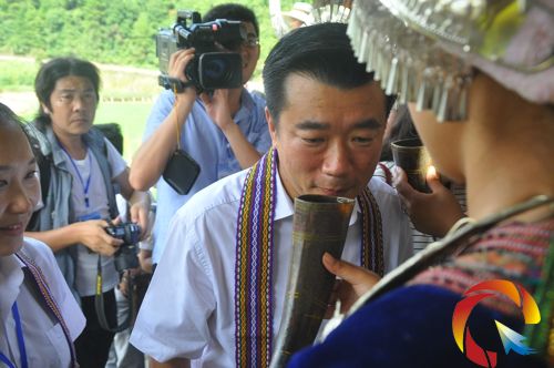 當日下午,伴隨著氣勢恢宏的迎賓蘆笙,中國作協副主席葉辛,國家發改委國際合作中心主任助理陳喆,瑞士議長代表團的代表等嘉賓和各個媒體的記者,一踏上進寨的石階,就飲上了當地自釀的醇香米酒,旅途疲憊立即一掃而光。