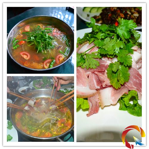 劍河風味館的參賽名菜便是這道酸爽宜人的黑毛豬酸湯,湯底的酸湯是用米湯或淘米水加無葉蔬菜存于水桶、竹筒、瓷缸或壇內放置在火塘邊,每天煮飯時把米湯或淘米水放入其中,以后便自然發酵而成。酸湯在做湯底時,還加上大大的“筒子骨”和姜一起煮沸,這樣味道不僅酸,還鮮香。最后加上本地農民所種植的“毛辣果”,鋪上香菜和撒上木姜子,便出鍋了。