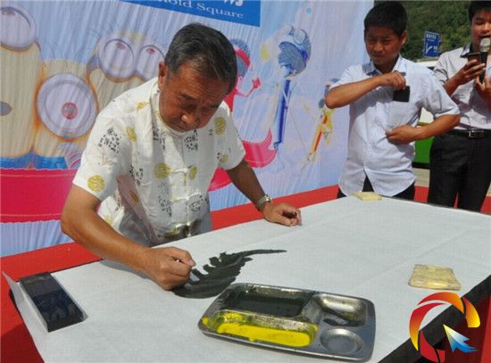 “貴州怪杰”唐世友應邀參加了開幕式并現場進行拳畫指書表演,所謂拳畫,就是用拳頭作畫,指書,則是用手指頭寫字。工作人員將宣紙鋪在桌面上,唐世友右手握拳,蘸上墨汁,在宣紙上揮舞起來,因為他是在舞臺上作畫,臺下的觀眾看不清楚,無奈之下,部分觀眾大著膽子,走上舞臺,近距離觀瞧,工作人員攔都攔不住。